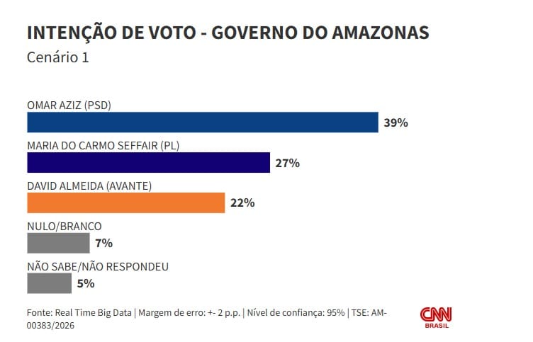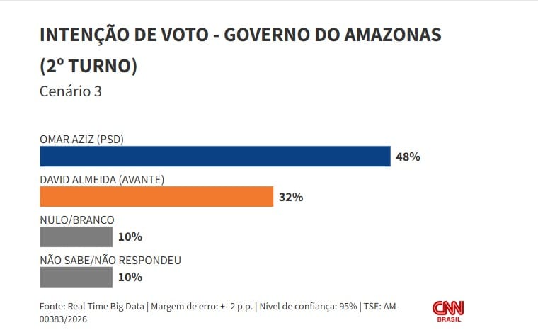 No segundo cenário do levantamento, Aziz permanece à frente, com 37% das intenções de voto, seguido por Seffair, que tem 26%. Almeida aparece em terceiro, com 19%, e o atual vice-governador do Amazonas, Tadeu de Souza (PP), surge com 8%.